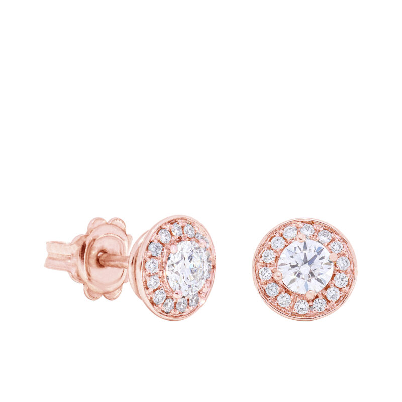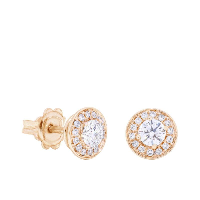 Klassikalised naelkõrvarõngad ümmarguste laboriteemantidega, mida ümbritsevad säravad väiksemad ümmargused, luues keskmise kivi ümber valguskiirgava efekti.