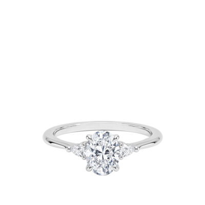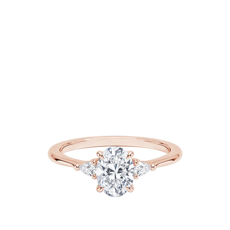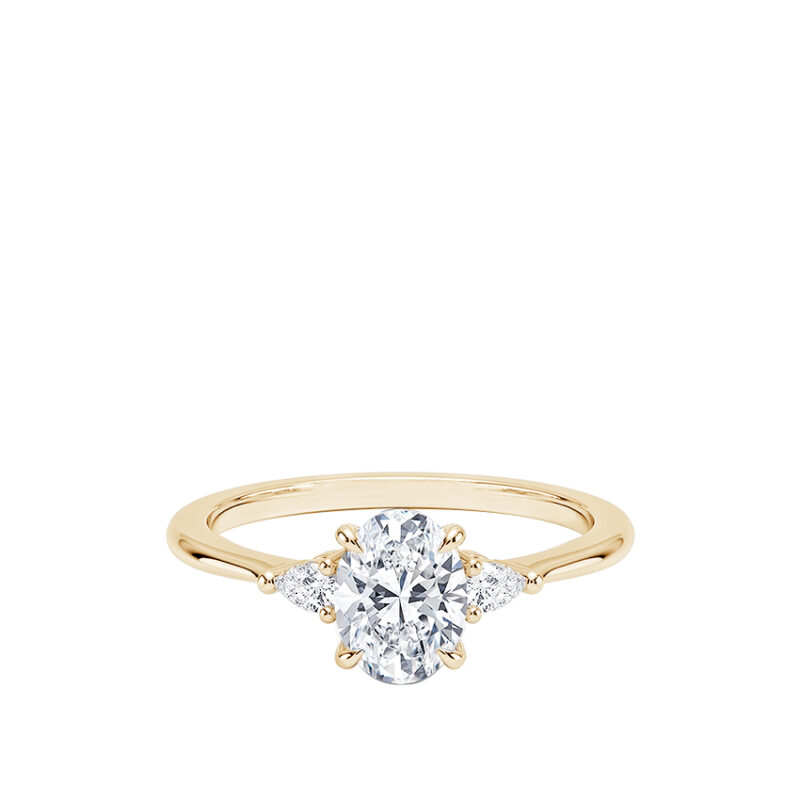 Selle väljapaistva kullast kihlasõrmuse keskset ovaal-kujuga laboriteemanti ümbritsevad 2 tilk-kujulist laboriteemanti.